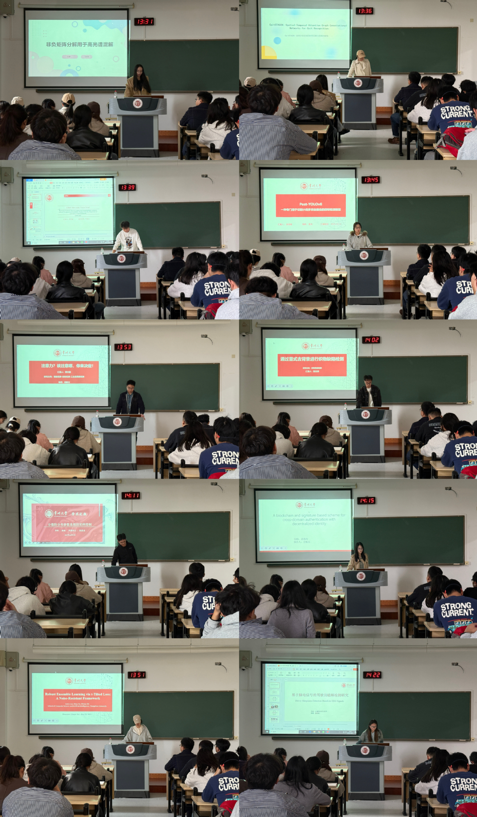 本次学术活动依托汇报分享、交流对话等多样化路径,展示阶段性科研成果,有效传递实践学习经验。活动中,十一位2023级研究生分别就非负矩阵分解用于高光谱混解(王如玉)、Robust Ensemble Learning via t-Tilted Loss:A Noise-Resistant Framework(徐昕瑜)、GaitSTAGCN:Spatial-Temporal Attention Graph Convolutional Networks for Giat Recognition(王奥飞)、LsNet:See Large,Focus Small(李良晶)、Pest-YOLOv8一种专门用于识别小而多农业害虫的目标检测模型(朱悦杨)、智能检测-目标检测-工业品瑕疵检测(黄文富)、通过显示去背景进行织物缺陷检测(陈云涛)、基于特征表示的异常检测方法(陈灏文)、 分数阶分数参数系数的采样控制(张晨龙)、A blockchain and signature based scheme for cross-domain authentication with decentralized identity(全航仪)、基于脑电信号的驾驶员瞌睡检测研究(张一帆)等课题方向进行交流分享。现场氛围热烈。