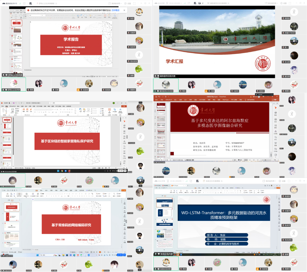 本次学术活动通过汇报分享、交流对话等多种方式,展示科研成果、分享学习经验。活动中,八位2023级研究生分别就研究边缘计算(王毅)、基于多尺度表达的阿尔兹海默症多模态医学图像融合研究(刘彦伶)、基于常维码的网络编码研究(王璇)、基于区块链的智能家居隐私保护研究(朱浩天)、面向复杂场景下的城市街景图像语义分割方法研究(张旭东)、WD-LSTM-Transformer:多元数据驱动的河流水质精准预测框架(张辰)、面向隐私保护的头发属性编辑(罗悦心)、功能磁共振成像(fMRI)数据中判别性瞬时特征的提取及应用(任一杰)等课题方向进行交流分享。