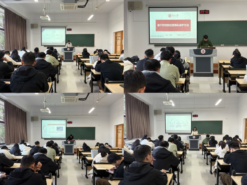 本次学术活动依托汇报分享、交流互动等多样化路径,展示阶段性科研成果,有效传递实践学习经验。活动中,七位2023级研究生分别就多模态情感特征引导的场景适应性表情生成(宋可馨)、基于时空的位置隐私保护方法(何鹏)、面向LBS的多层次位置隐私保护方法研究(倪诗云)、基于脑电和眼动的跨文化情感识别研究(徐劲龙)、用于多类细胞核检测的仿射一致变换器(程可)、无监督的工业异常检测(李抒恒)、基于多智能体的交通网生态研究(杨帆)等课题方向进行交流分享。互动研讨环节聚焦学术前沿课题,现场交流氛围热烈。