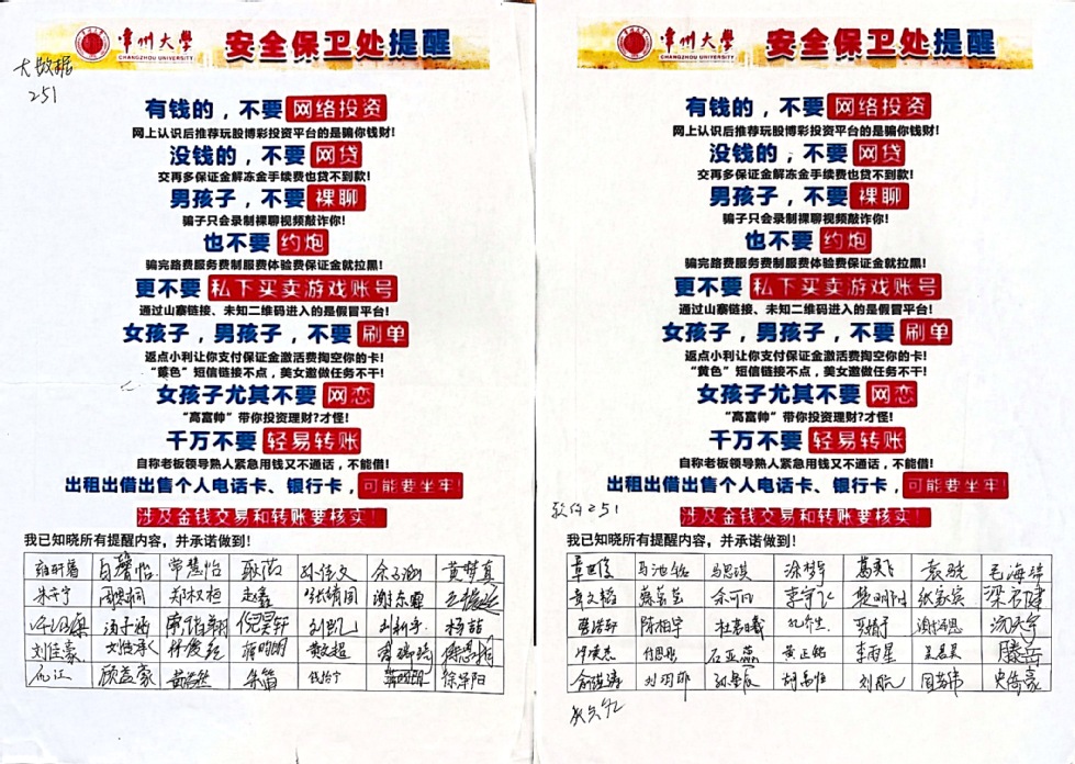 在各班级反诈班会上,辅导员老师和班级反诈委员围绕 “冒充客服类”“刷单返利类”、“虚假贷款类”等电信网络诈骗常见类型展开讲解,通过播放反诈宣传视频,直观展示诈骗手段的多样性。视频通过还原真实受骗场景、拆解诈骗话术逻辑,直观呈现电信网络诈骗的隐蔽性与危害性,引导学生认清诈骗本质,深入剖析诈骗分子利用学生社会经验不足、防范心理薄弱等特点设计的作案套路。最后,全体同学在反诈宣传单页上签名,承诺提高警惕、不参与涉及诈骗的行为。