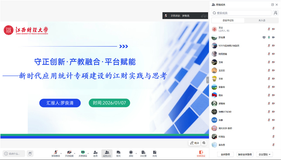 为进一步拓宽师生学术视野,深化对应用统计专业的认知,精准推进应用统计专硕建设工作,1月7日下午,学院召开应用统计专硕建设指导线上会议。本次会议邀请国家级万人计划教学名师、江西财经大学二级教授、博士生导师罗良清教授线上指导,学院党委书记王峰、师生代表共同参与了此次会议。