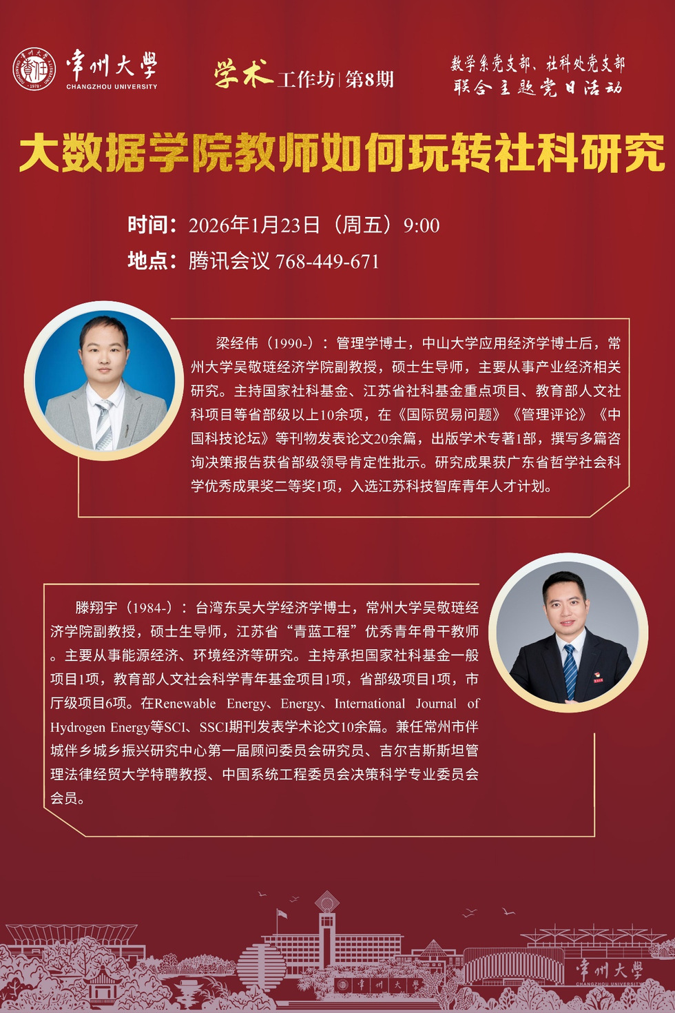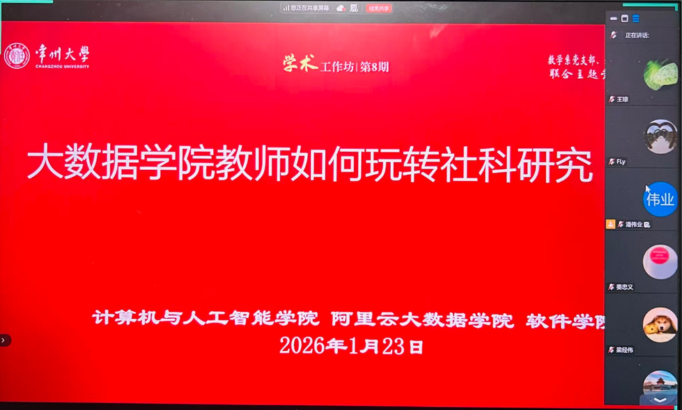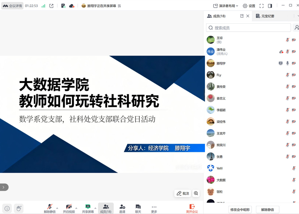 为深化支部共建内涵,推动党建与科研业务深度融合,1月23日上午,学院数学系教工党支部联合校人文社科处党支部开展主题党日活动,围绕“大数据学院教师如何玩转社科研究”进行专题研讨。学院党委书记王峰出席并讲话,数学系全体教师参会,两位跨学科研究与项目申报领域的资深专家梁经纬、滕翔宇老师受邀线上作专题分享与精准指导。