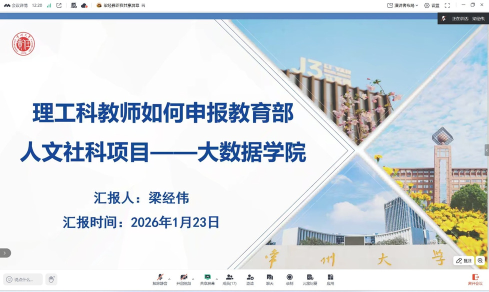 会上,梁经纬结合大数据学院学科特色,从学科交叉、自身基础、社会科学需求三个维度,系统解析教育部人文社科项目申报路径。他强调,要立足数学、统计学、人工智能等理工科方法论优势,主动对接社科领域关键现实问题,实现文理交叉、双向赋能;并结合实例讲解选题破题、论述梳理、技术路线可视化等实操技巧,剖析国家社科基金与教育部人文社科项目申报的要点及差异化策略。