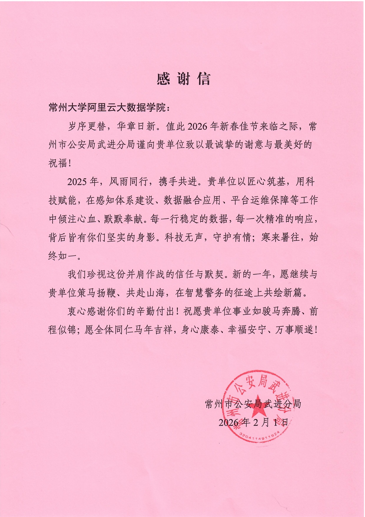近日,常州大学阿里云大数据学院再次收到常州市公安局武进分局发来的感谢信。信中对学院在过去一年中以科技匠心赋能公安实战,在感知体系建设、数据融合应用及平台运维保障等工作中提供的坚实支撑表示高度认可与诚挚感谢。