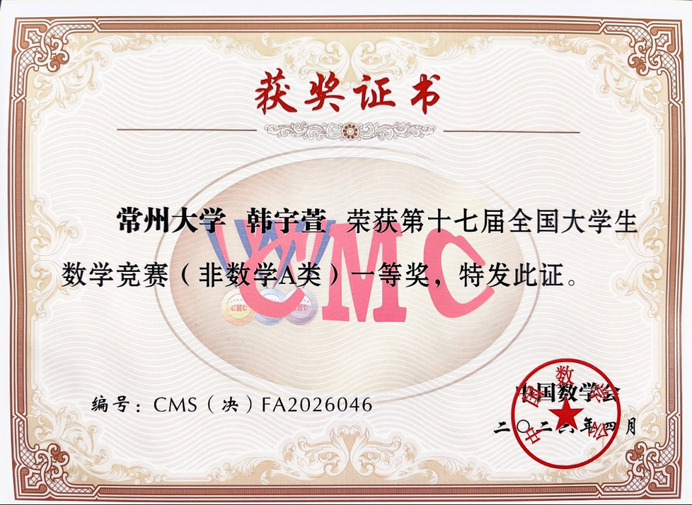 本届决赛按数学类高年级组、数学类低年级组、非数学A类和非数学B类四个组别进行角逐。韩宇萱同学参加的非数学A类组竞争尤为激烈,江苏省仅有29名学生入围该组别全国决赛。此前,她以江苏赛区一等奖、省内排名第28的优异成绩晋级全国决赛,最终在全国决赛中位列非数学A类第46名。江苏省内仅东南大学、南京航空航天大学、南京理工大学、河海大学有选手成绩位列其前。韩宇萱表示:“备赛与参赛的过程,是对数理思维的深度打磨,也让我学会了耐心攻坚,锻炼了逻辑推导与临场抗压能力。未来我会带着竞赛收获的韧性,继续钻研精进,不驰于空想,在每一次学习与实践中扎实积累。”